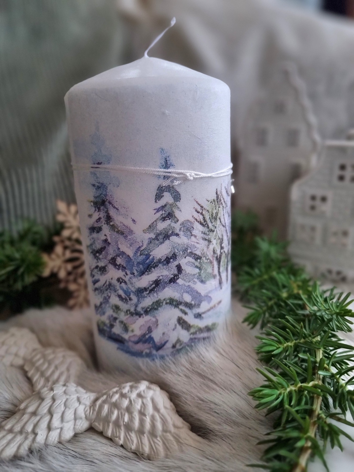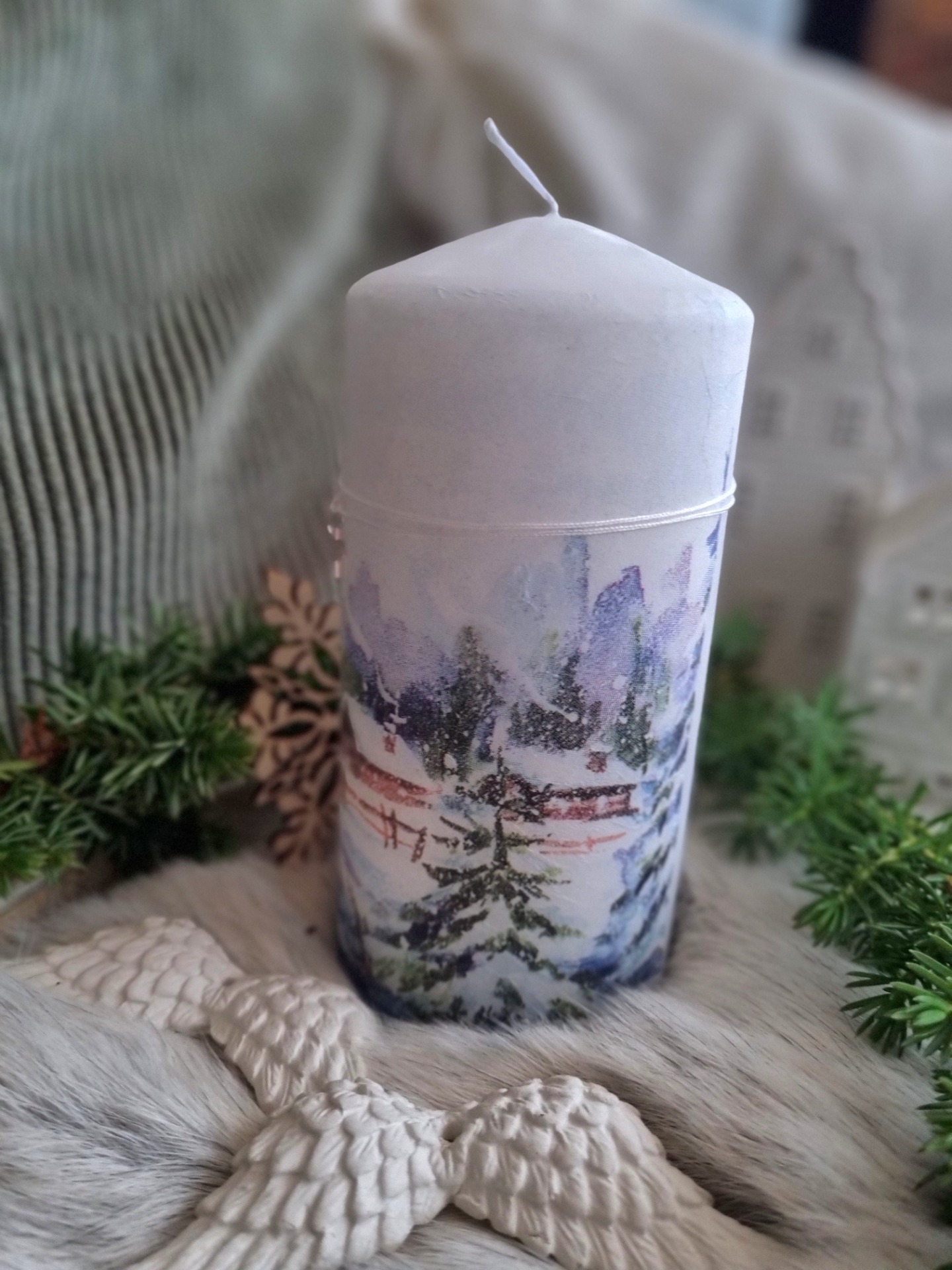 Sviečka s krásnym zimným motívom . Dozdobená kovovou hviezdičkou. Pri horení nesteká. Motív aplikovaný technikou decoupage,